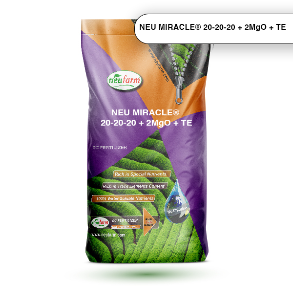 NEU MIRACLE® 20-20-20 contains balanced NPK formulation enriched with 2% MgO and EDTA-chelated trace elements (B, Cu, Fe, Mn, Zn) for steady growth and rapid nutrient uptake.