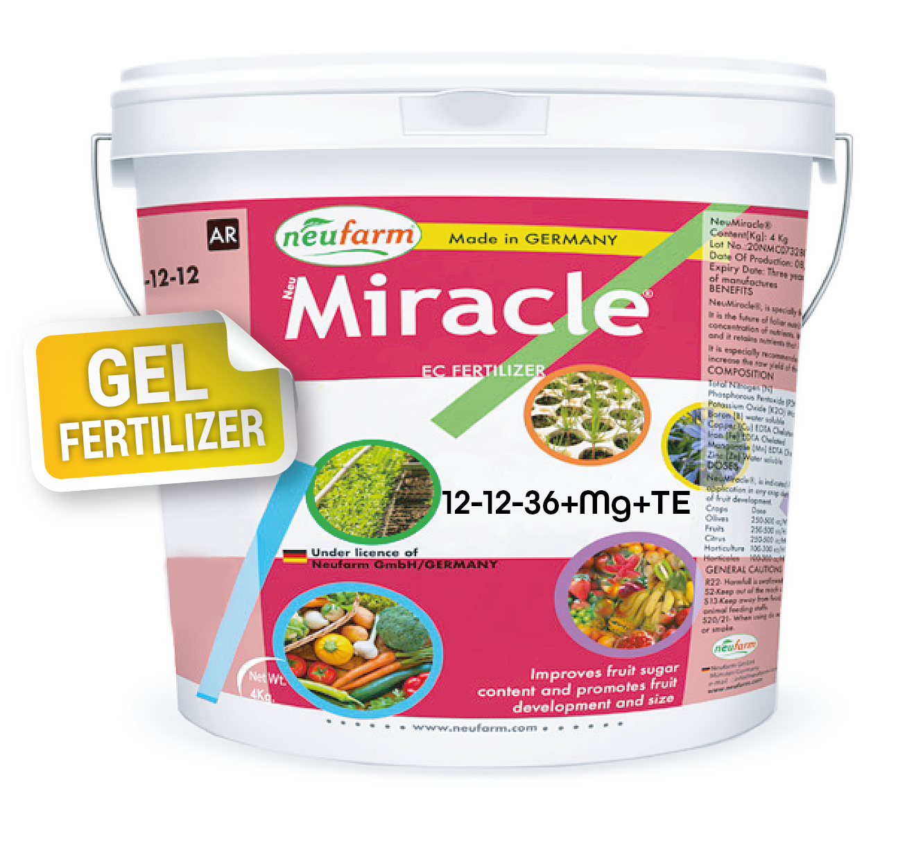 Miracle Special Potash® 12-12-36 Gel contains balanced nitrogen and phosphorus with high potassium and added magnesium, supplemented with EDTA-chelated trace elements (B, Cu, Fe, Mn, Zn) to support fruit development and photosynthetic activity.